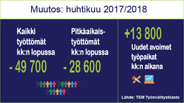 Tilastokeskuksen työvoimatutkimuksen mukaan työllisiä oli huhtikuussa 48 000 enemmän kuin vuotta aiemmin. Työllisyysaste oli 70,1 prosenttia, mikä on 1,5 prosenttiyksikköä korkeampi kuin edellisen vuoden huhtikuussa. Työvoimatutkimuksen mukaan työttömiä oli 233 000, mikä oli 45 000 vähemmän kuin vuosi sitten. Työttömyysaste oli 8,6 prosenttia eli 1,7 prosenttiyksikköä matalampi kuin vuotta aiemmin.