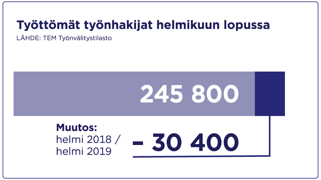 Tilastokeskuksen työvoimatutkimuksen mukaan työllisiä oli helmikuussa 34 000 enemmän kuin vuotta aiemmin. Työllisyysaste oli 70,7 prosenttia, mikä on 0,9 prosenttiyksikköä korkeampi kuin edellisen vuoden helmikuussa. Työvoimatutkimuksen mukaan työttömiä oli 200 000, mikä oli 33 000 vähemmän kuin vuosi sitten. Työttömyysaste oli 7,4 prosenttia eli 1,2 prosenttiyksikköä matalampi kuin vuotta aiemmin.