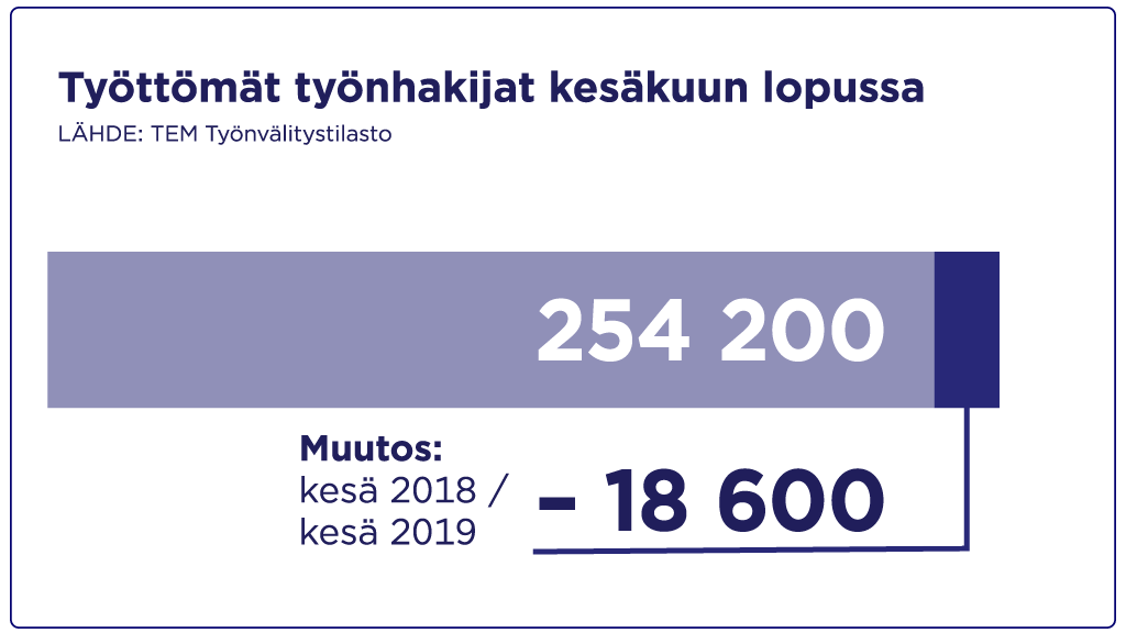 Tilastokeskuksen työvoimatutkimuksen mukaan työllisiä oli kesäkuussa saman verran kuin vuotta aiemmin. Työllisyysaste oli 75,7 prosenttia, mikä on 0,2 prosenttiyksikköä korkeampi kuin edellisen vuoden kesäkuussa. Työvoimatutkimuksen mukaan työttömiä oli 176 000, mikä oli 16 000 vähemmän kuin vuosi sitten. Työttömyysaste oli 6,2 prosenttia eli 0,5 prosenttiyksikköä matalampi kuin vuotta aiemmin.