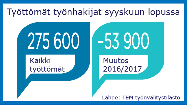 Työ- ja elinkeinotoimistoissa oli syyskuun lopussa yhteensä 275 600 työtöntä työnhakijaa. Se on 53 900 vähemmän kuin vuotta aikaisemmin. Työttömien työnhakijoiden määrä väheni edellisestä kuusta 13 200:lla. Tiedot ilmenevät työ- ja elinkeinoministeriön Työllisyyskatsauksesta.