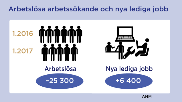 Vid arbets- och näringsbyråerna fanns det i slutet av januari sammanlagt 342 900 arbetslösa arbetssökande. Det är 25 300 färre än ett år tidigare. Från föregående månad minskade antalet arbetslösa arbetssökande med 15 200. Uppgifterna framgår av arbets- och näringsministeriets sysselsättningsöversikt.