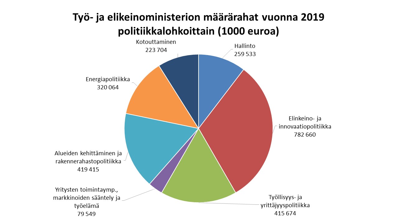 Ministeriön hallinnonalan määrärahat ovat vuonna 2025 noin 3,7 miljardia euroa, mikä on 4,1 prosenttia valtion talousarvion loppusummasta. Hallinnonalan myöntämisvaltuudet talousarviovuonna ovat yhteensä vajaat 2,3 miljardia euroa.