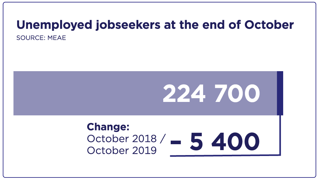 A total of 224,700 unemployed jobseekers were registered at the Employment and Economic Development Offices at the end of October. This was 5,400 fewer than a year earlier. The number of unemployed jobseekers was down by 1,300 from the previous month. These figures are from the Employment Bulletin of the Ministry of Economic Affairs and Employment.