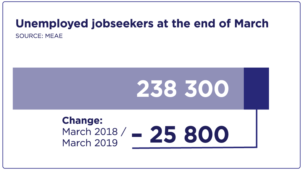 A total of 238,300 unemployed jobseekers were registered at the Employment and Economic Development Offices at the end of March. This was 25,800 fewer than a year earlier. The number of unemployed jobseekers was down by 7,500 from the previous month. These figures are from the Employment Bulletin of the Ministry of Economic Affairs and Employment.