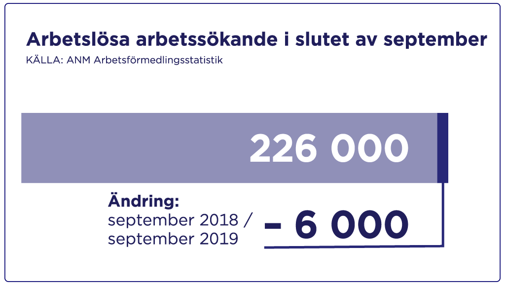 Vid arbets- och näringsbyråerna fanns det i slutet av september sammanlagt 226 000 arbetslösa arbetssökande. Det är 6 000 färre än ett år tidigare. Från föregående månad minskade antalet arbetslösa arbetssökande med 6 600. Uppgifterna framgår av arbets- och näringsministeriets sysselsättningsöversikt.