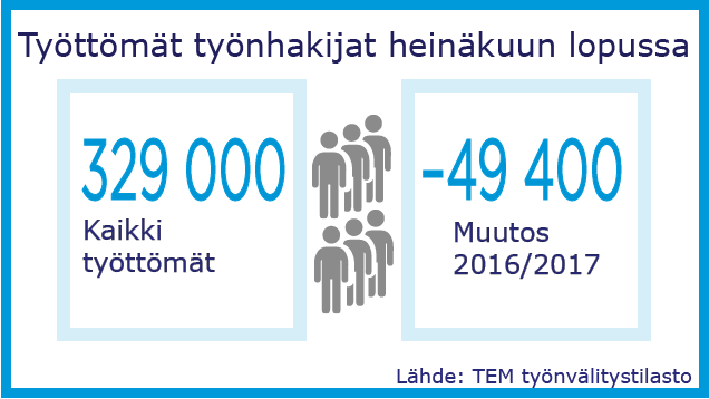 Työ- ja elinkeinotoimistoissa oli heinäkuun lopussa yhteensä 329 000 työtöntä työnhakijaa. Se on 49 400 vähemmän kuin vuotta aikaisemmin. Työttömien työnhakijoiden määrä lisääntyi edellisestä kuusta 8 900:lla. Tiedot ilmenevät työ- ja elinkeinoministeriön Työllisyyskatsauksesta.