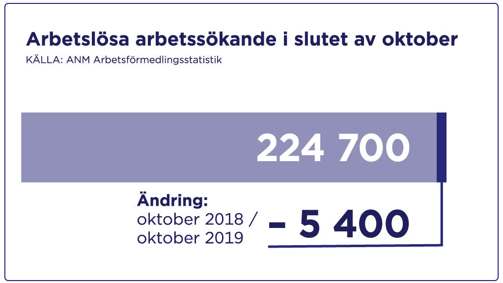 Vid arbets- och näringsbyråerna fanns det i slutet av oktober sammanlagt 224 700 arbetslösa arbetssökande. Det är 5 400 färre än ett år tidigare. Från föregående månad minskade antalet arbetslösa arbetssökande med 1 300. Uppgifterna framgår av arbets- och näringsministeriets sysselsättningsöversikt.